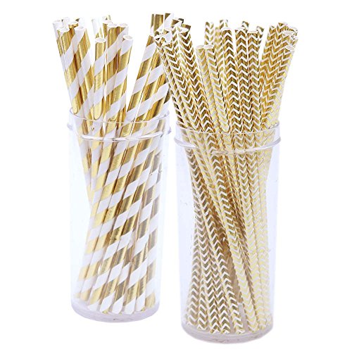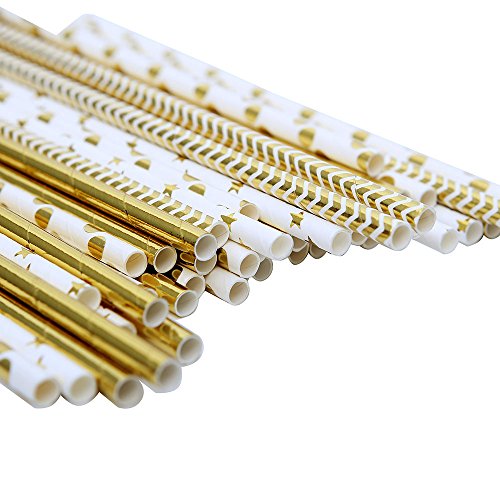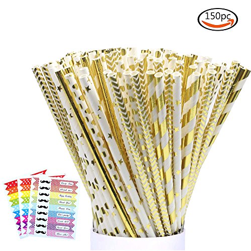 LoveS 150 Pack Biodegradable Paper Straw for Birthdays, Weddings, Baby Showers, Celebrations and Parties, Gold, White