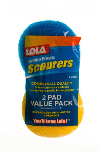 Studio : Lola Products Publisher : Lola Products Binding : Kitchen Product Description This is Lola's 2-pack of Jumbo Plastic Mesh Scourer made of a polypropylene knitted mesh that won't scratch non stick or coated cookware. It is odor resistant and rust proof. Its jumbo size lends itself to the really big jobs. Measures: 6.5-Inch L by 1.5-Inch H by 4.625-Inch W. 0