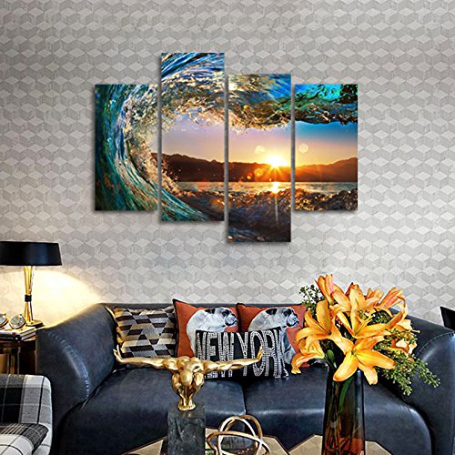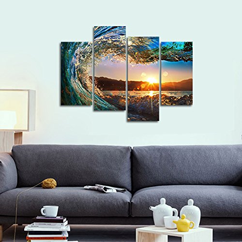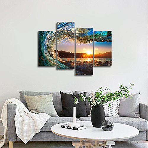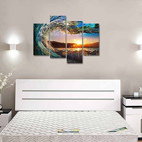 4 panels high definition modern ocean sea beach giclee canvas paintings wall art prints is gallery wrapped ready to hang for home decorations wall decor. Each panel has a black hook already mounted on the wooden bar ready to hang out of box.