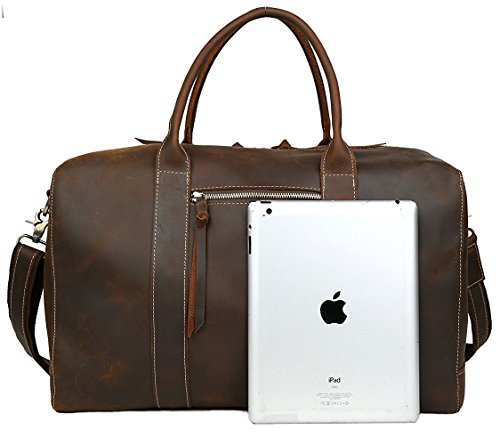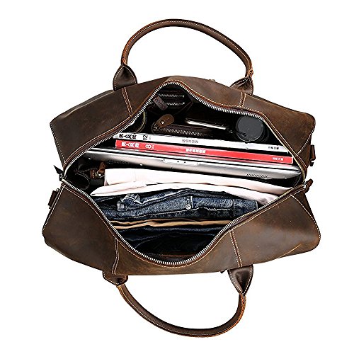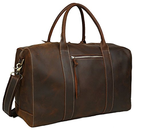-. Feature : Dimensions: 18.3 x 8.7 x 11 inch; Cabin approved size; Can hold 15.6" Laptop / Genuine leather duffel; Good for weekend, vocation, 1 to 3 days business trip / 1 exterior zip pocket, 1 inside layer zipper pocket, 1 zip pocket, 2 open pockets / Adjustable and detachable shoulder strap with comfortable padding / Strong stitching, handcrafted by professional artisans for long lasting durability that looks better with age