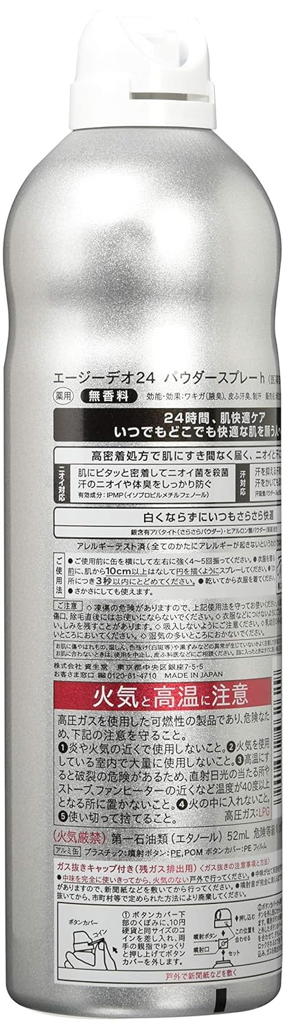 全成分:イソプロピルメチルフェノール*,焼ミョウバン*,アパサイダーC,ヒアルロン酸ナトリウム(2),合成ケイ酸ナトリウム・マグネシウム,濃グリセリン,液化石油ガス,無水エタノール,タルク,メチルフェニルポリシロキサン,無水ケイ酸,パルミチン酸4-エチルヘキシル,ポリオキシエチレン・メチルポリシロキサン共重合体,ステアリン酸カルシウム,被覆粉末EZ(酸化亜鉛)*は「有効成分」無表示は「その他の成分」