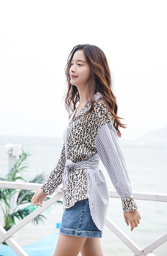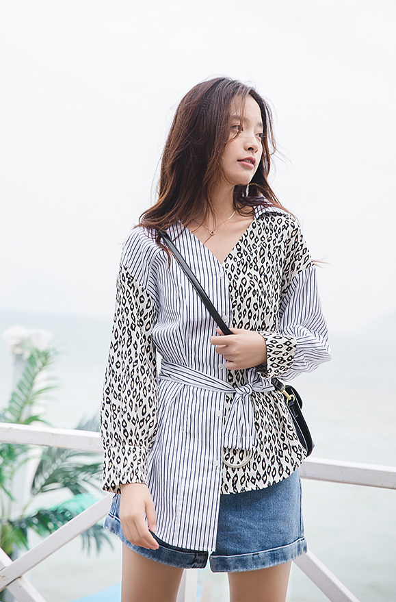 ヒョウ柄とストライプの組み合わせが印象的でセクシーな雰囲気の、長袖Vネックシャツです。