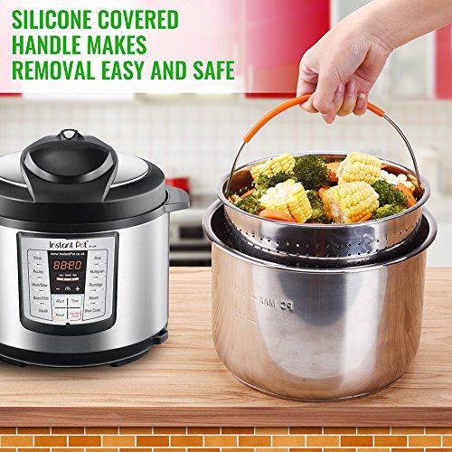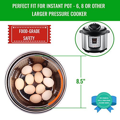Fits 6 or 8 quart Instant Pot, as well as other larger electric pressure cooker. 1 inch trivet are high enough to keep above the water. Wide and holey baskets allow more ways for steam to penetrate the basket, easy to steam food evenly.