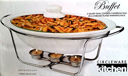 -. Feature : 2-quart oval casserole is 14.75" W x 9.5" D x 3" H / Clear glass cover / Three candles included / Chrome plated warming rack