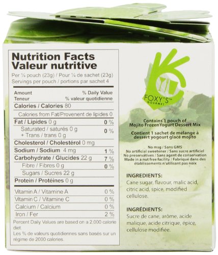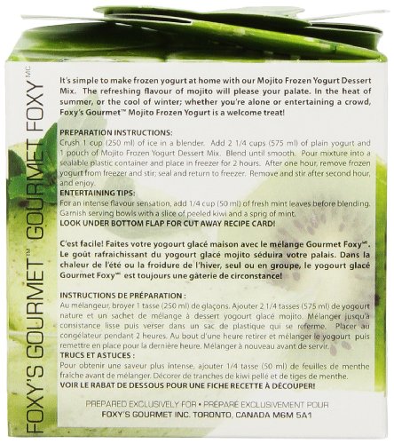 Studio : Foxy Gourmet Publisher : Foxy Gourmet Binding : Grocery Product Description Its simple to make frozen yogurt at home with our Mojito Frozen Yogurt mix. The smooth flavours of Mojito will indulge your palate. In the heat of summer, or the cool of winter; whether you're alone or entertaining a crowd, Foxys Gourmet Mojito Frozen Yogurt is a welcome treat. 0