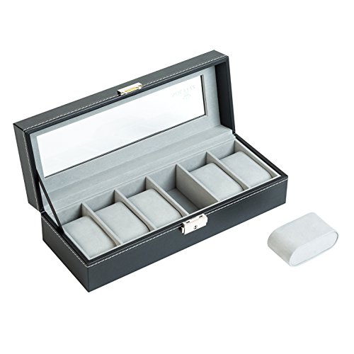 Soufull Watch Box PU Leather Watch Case Glass Top Jewelry Case Organizer with Metal Lock and Key