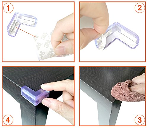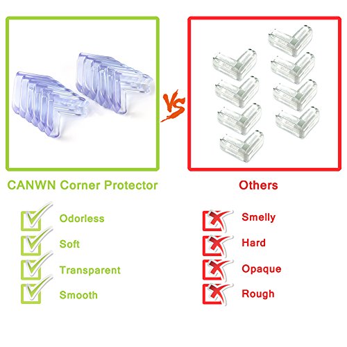 1.Features: 1.1.Effective Protection: Canwn safety corner protectors guards set is a perfect solution to your furniture and keep your baby safe. Just set the corner protectors guards for your furniture and give your baby a safe environment. No longer afraid of sharp corners. 1.2.Ultimate Protection: Soft L shaped design just fits your furniture and works better to absorb impact and protect your baby from the hard and sharp corners in home, kindergartens, schools, hospitals. You can relax a little when Caring Corners are installed. 1.3.Crystal Clear: It will keep the natural beauty of the furniture and can decorate your table corner without drawing much of your attention. No more bulky, ugly colored foam or rubber! These will adhere to most surfaces as long as the surface is smooth and clean. 2.Installation Instruction: 2.1.Clean surface. We recommend rubbing alcohol for most surfaces but may not be applicable for all surfaces. 2.2.Let surface dry completely. ( Make sure the table corners clean and dry before using.) 2.3.Remove backing and position the corner on furniture. 2.4.Smooth out any air bubbles. 2.5.Press and hold each side firmly for at least 60 seconds. Wait at least 24 hours for full adhesion before testing.