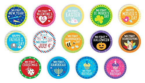 First holiday stickers are a fun unique way to record your baby's first celebrations^Includes 14 adorable stickers^Stickers feature cute colorful designs for each holiday^Easy to peel and stick on clothing^Adorable gift for new parents