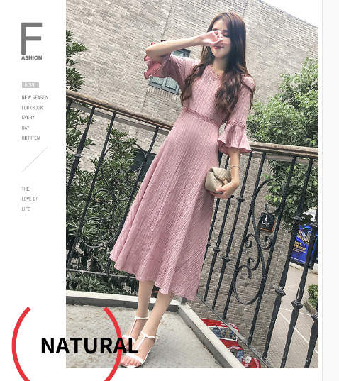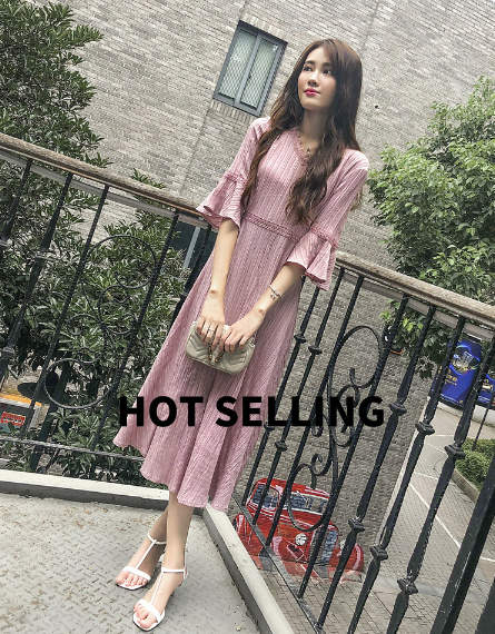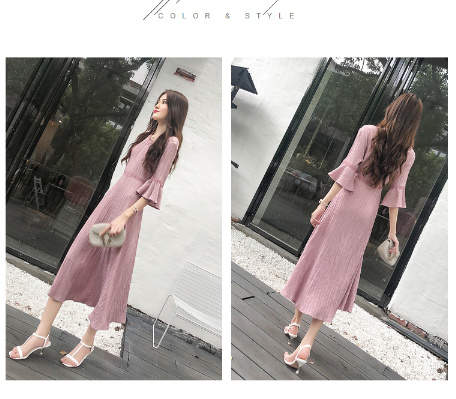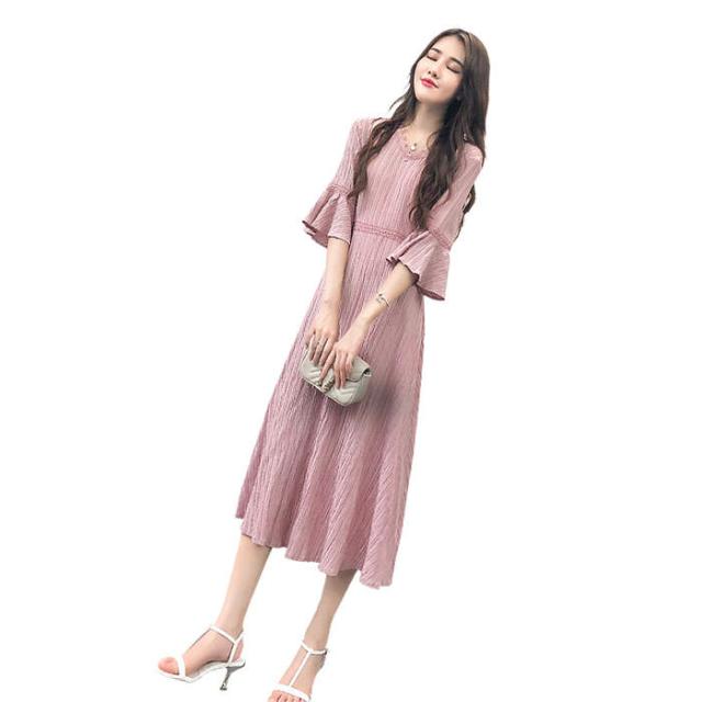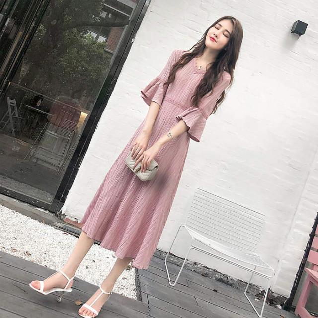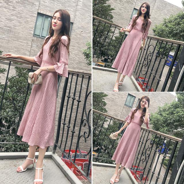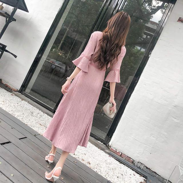 女性の服 Vネック 七分袖 ワンピース 2018年秋トレンド ピンク