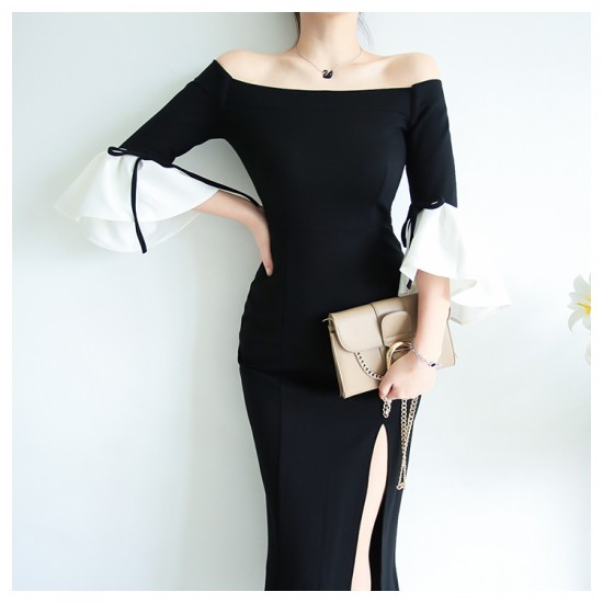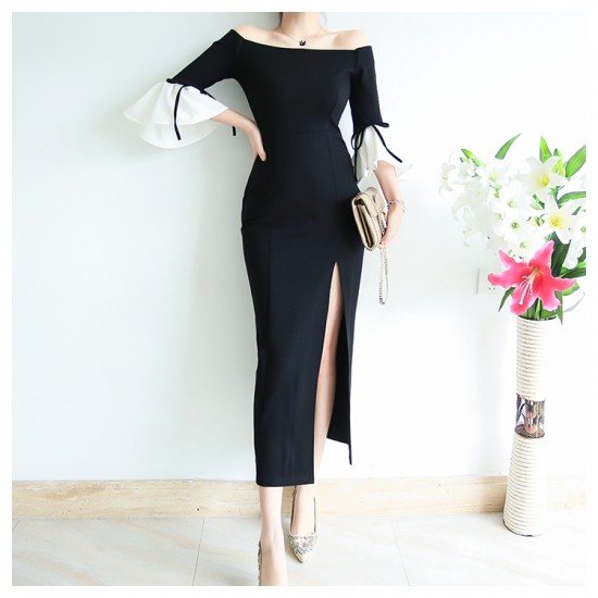ドレス タイト ワンピース セクシー 大人レディ パーティ 結婚式 レディース ミモレ丈 オフショルダー フリル フェミニン drgz0568
