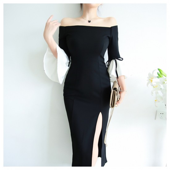 オフショルダーに大きくあいた胸元とスリットが入ったミディアムタイトスカートが大人レディな印象のタイトスカートワンピース・ドレス。