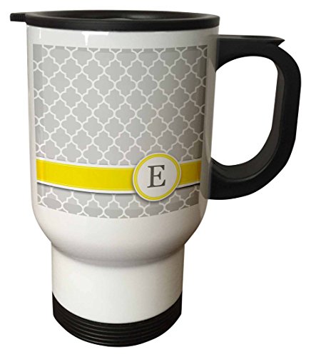 3dRose tm_154571_1 Your Personal Name Initial Letter E Monogrammed Grey Quatrefoil Pattern Personalized Yellow Gray Travel Mug, 14 oz, White