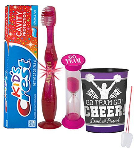 -. Feature : Turn something your kids have to do into something they want to do...Because when brushing is fun, it gets done! / (1) Firefly Youth Flashing Lights Suction Cup Toothbrush (Assorted Colors) (1) Kids Crest Cavity Protection Sparkle Fun Toothpaste, 2.7 oz / (1) Cheerleader Themed 16 Oz Mouthwash Rinse Cup! Doubles As Toothbrush Holder! / (1) Dentist Recommended 2 Minute Cheer Themed Brushing Timer (Assorted Styles) / Plus Bonus "Remember to Brush" Visual Aid Tooth Saver Necklace. Hang it in their bathroom or by their bed so they remember to keep their chompers sparkly fresh. You could also use these tooth charms to save one of your child's baby teeth.
