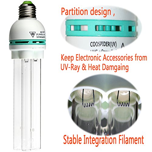 Studio : Coospider Publisher : Coospider Product Description UV Quartz Germicidal CFL Lamp AC 120v 25w, All the bulbs are checked before delivery, so there looks something staining on the inside light tube (Mercury). The lamp ideal for 0-400 sq ft. and 15-60 minutes per week is recommended High Transparent T5 (5/8inch) Quartz tube, keep the lamp High UV Ozone emitting and the lamp long lifespan, after sterilizer, there smells Unpleasant, please Keep ventilation, until the ozone disappeared Pet/ People/ Plant AVOID directly exposed under UV-C irradiation and Ozone. And Both of them will fade the colorful Furniture Clothes Picture etc.. After used, please Well packed keep out of children's reach Bathroom, kitchen, bedroom, living room, dining room, office, Dog cat pet cage, disinfect and Clean by sanitizer to remove the smell can also be used for the new decoration of the smell of heavy places to eliminate odor.