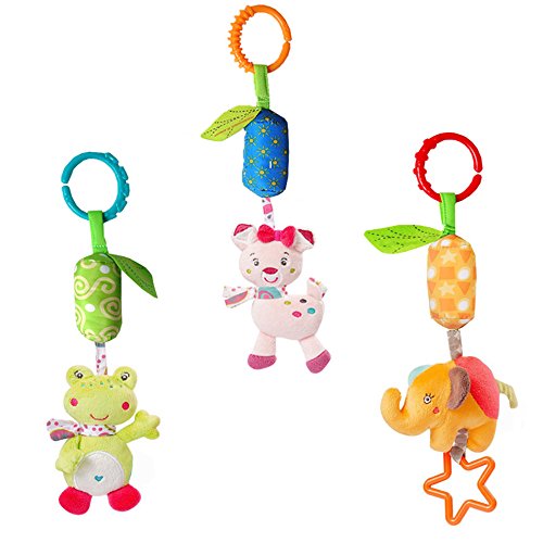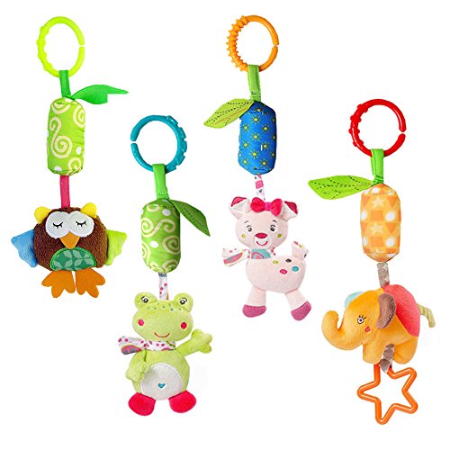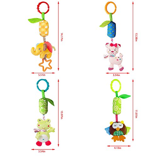 Each book Built-in BB device,cute voice will make your baby laguh once your baby or toddler press it.Which includes:Owl,frog, sheep,elephant.Your infant will love this set of 4 soft hanging rattle!