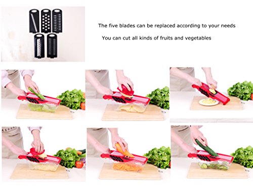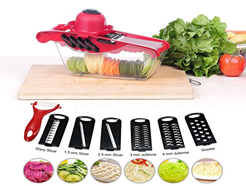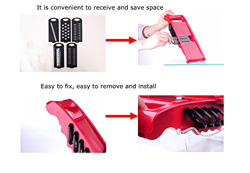 - *There are 6 kinds of blades, including 1.5mm&2.5mm Slicer, 3mm&4mm Julienne, Grater, Wavy Slicer.you can according to different food and what you want to change the shape of the blade.