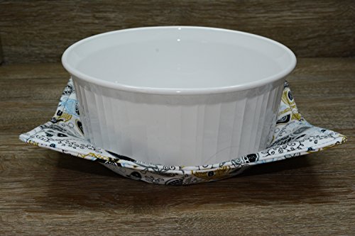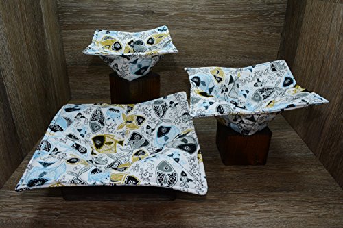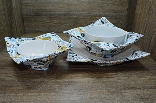 Product Description Microwave cozy set includes 1 small bowl cozy (Approx 6.5" sq), 1 medium bowl cozy (Approx 8" sq), 1 dinner plate cozy (Approx 10" sq.) The dinner plate cozy can also be used for round casserole dishes and the small size is great for coffee mugs! These microwave cozies are the perfect solution to handling super-hot dishes. Cooking and reheating food in a dish cozy makes life so much easier! Place your microwaveable dish inside the bowl cozy and put the whole thing in the microwave to heat. To take the bowl out, you simply grab the corners of the cozy. We found that our kids can now get their dishes out of the microwave safely. Cozies will also protect your fingers from the cold when holding a bowl of ice cream and are great for protecting your table. You can also use a cozy placed on top the dish you are microwaving to help steam food. MATERIALS: * 100% cotton fabric * 2 layers of 100% cotton batting * 100% cotton thread Please be advised: Bowl cozies must only be used in microwaves with a rotating base. To avoid scorching or burning, please make sure cozy freely rotates in your microwave. Never leave microwave unattended. Make sure cozy is clean with no pieces of food attached. Do not microwave cozy for more than three minutes. Cozies can be machine washed on delicate cycle. Reshape and allow to air dry for best results. Please let us know if this is a gift, and we will ship without a packing slip enclosed! #bowlcozy #microwaveable #handmadeatamazon #hot4handmade #buyhandmade 0