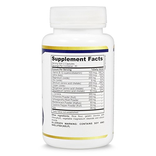 NON-GMO VEGETARIAN FORMULA - Gluten Free, Soy Free, Non-GMO formula contains an all-natural blend of vitamins, minerals, herbs and amino acids crafted by experts in the field of modern nutritional science. Ingredients include: Vitamin B-12, iodine, magnesium, zinc, selenium, copper, manganese, molybdenum, l-tyrosine, schizandra, ashwagandha root, bladderwrack, & cayenne pepper. Effective for both men and women