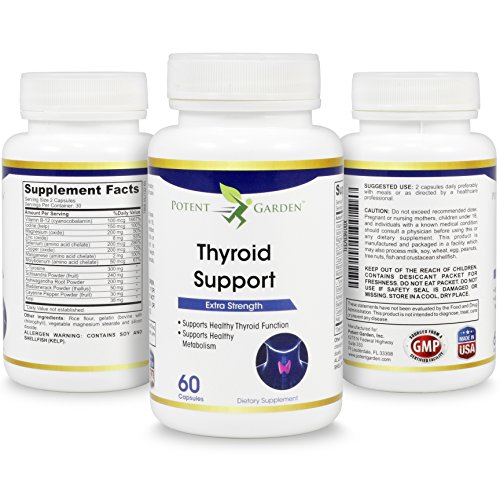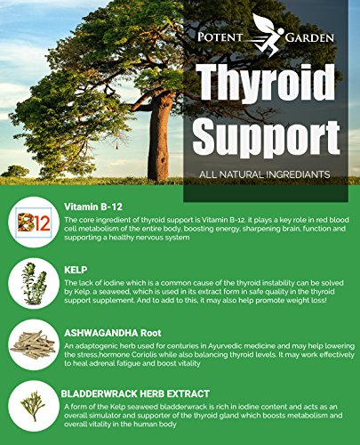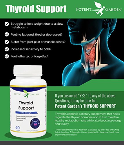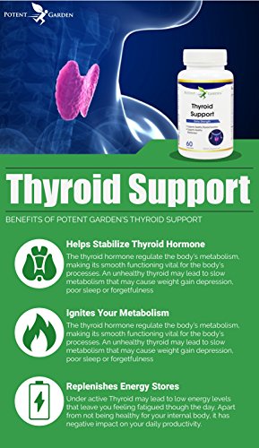 Weight gain, Depression, Dry skin & hair, Feeling tired or fatigued, Joint pain Aches, pain or stiffness, Increased sensitivity to cold, Potent Gardens Thyroid Supplement Premium Blend Of Ingredients: Support Energy Levels & concentration, Boost your metabolism, Promote a sense of overall well being & mood enhancement, Support weight loss and more Each capsule is like taking 14 thyroid supplements with: Vitamin B12, Iodine, Magnesium, Zinc, Selenium, Copper, Manganese, Molybdenum, L-tyrosine, Schizandra, Ashwagandha Root, Bladderwrack, Cayenne Pepper, Kelp