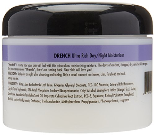 Drench ultra-rich day by night moisturizer 8 ounce. Drenched is exactly how your skin will feel with this miraculous moisturizing mixture. The days of cracked, chapped, dry, sensitive skin are gone. Once you have experienced Drench. There is no turning back. Your skin will love you.