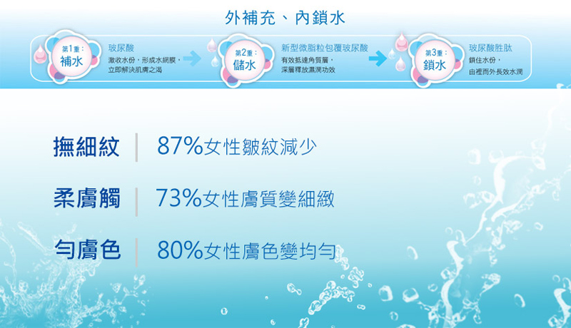 主成分:玻尿酸、新型微脂粒包覆玻尿酸、玻尿酸胜肽、石蓴精萃