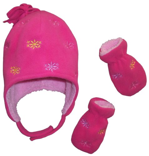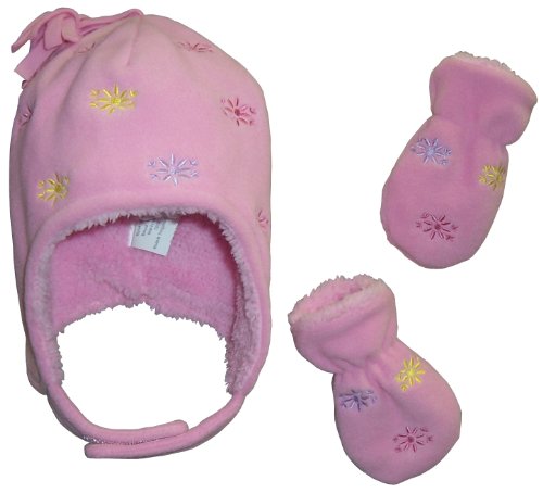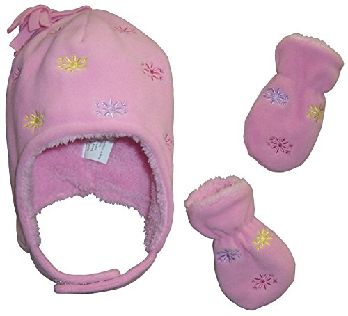 Binding : Apparel Product Description N'Ice Caps TM girls sherpa lined micro fleece set with flowers embroidery. 2 colors available: pink, fuchsia. 4 sizes. One size fits 3-6 months (label says 6-12mo, we recommend for 3-6mo), one size fits 6-18months, one size fits 18-36 months (label says 2T-4T), one size fits 3-5yrs (label says 4-7yr, we recommend for 3-5yr). For sizes 3-6 months and 6-18 months, the mittens do not have thumbs. For sizes 18-36 months and 3-5 years, the mittens have thumbs. Tested and approved as per CPSIA standards. 0