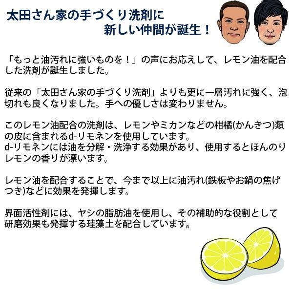 「もっと油汚れに強いものを」の声にお応えするために、「太田さん家の手づくり洗剤 レモン油配合」が誕生しました。レモン油を配合することにより一層油汚れに強く、泡切れも良くなりました。界面活性剤にはヤシの脂肪油を使用していますので、手に優しい洗剤となっております。 |