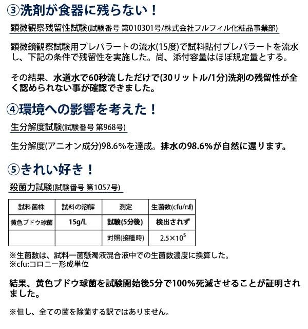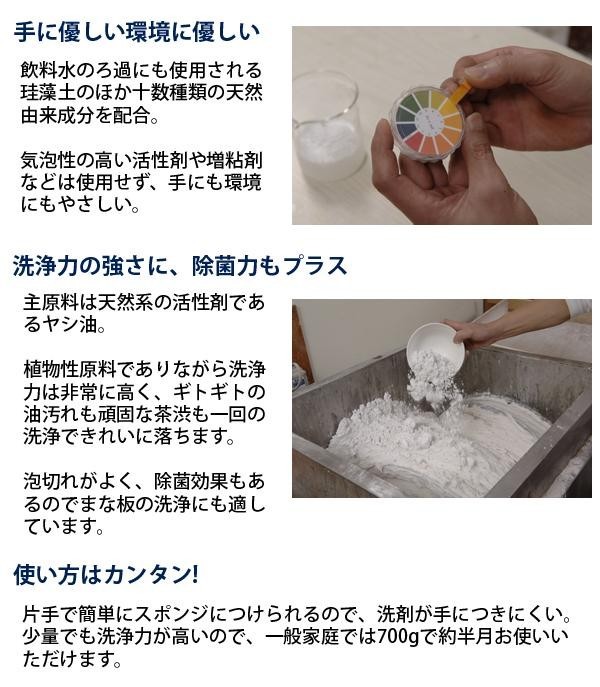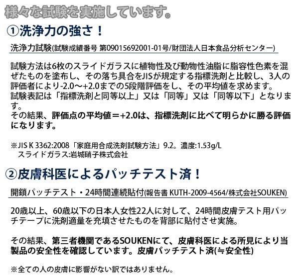 | 成分 | 界面活性剤:39%(直鎖アルキルベンゼンスルホン酸ナトリウム、ポリオキシエチレンアルキルエーテル、脂肪酸アルカノールアミド)、工程剤:硫酸塩、研磨剤:珪藻土、安定化剤、レモン油 |