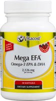 What is Vitacost Mega EFA Omega-3 EPA & DHA? Vitacost Mega EFA Omega-3 EPA & DHA is a premium-quality, purified fish oil supplement delivering high elemental levels of two of the most-studied omega-3 essential fatty acids: EPA and DHA. Omega-3 fatty acids are essential to the body and must be obtained through diet. Fatty fish, such as cod, tuna and salmon, are the best source, but they can also be found in some plant sources and in flaxseed, walnuts and soybeans. Most people do not eat enough of these foods, however, to obtain optimal amounts of omega-3 nutrients. In this case, taking a supplement such as Vitacost Mega EFA may be beneficial. Unlike other low-cost, low-grade fish oil supplements, which may contain traces of dioxin, mercury, PCBs and other environmental contaminants, Vitacost Mega EFA has been molecularly distilled to guarantee the freshest, purest product. Mega EFA also contains a higher milligram-per-serving amount of omega-3 fatty acids than other brands, with 800 mg of EPA and 400 mg of DHA in each two-softgel serving. How does Vitacost Mega EFA Omega-3 EPA & DHA support health?EPA and DHA are well known for their cardioprotective properties, their ability to maintain healthy cognitive function, their potential to support healthy moods and their positive impact on joint comfort and flexibility*Higher blood levels of omega-3 essential fatty acids including EPA and DHA are associated with a healthier mood*Why choose Vitacost Mega EFA Omega-3 EPA & DHA?Provides higher milligram-per-serving amount than other fish oil supplements (EPA = 800 mg and DHA = 400 mgin each two-softgel serving)Easy-to-swallow softgels with pleasant strawberry flavorMolecularly distilled to ensure mercury, dioxins and PCB levels are well below industry standardsAn economical and convenient way to meet the American Heart Associations recommendation to increase daily omega-3 fatty acid consumptionContains 15 ...Feature