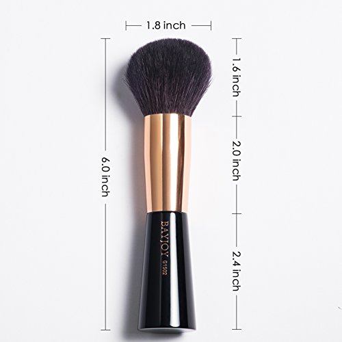 Material Of the BAYJOY G1502- Hand picked goat bristle is extra soft, fluffy and dense. It will absorb easily and distribute evenly of your precious powder. Rose gold glossy alloy ferrule makes the brush more attractive. Extra Smooth handle of the brush is made of recycled plastic and evenly coated with black color. This brush is marked with the gilded "BAYJOY" and "G1502" on the handle.