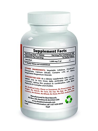 -. Binding : Health and Beauty -. Brand : Best Naturals -. EAN : 0817716015422 -. Feature : Cellular Detoxification* / Healthy Membrane Function* / Supports Liver Function* / Supports healthy hair & enhances mood / All Best Naturals products are manufactured in accordance with Good Manufacturing Practices (GMP), among the highest standards in the world -- Proudly Made in USA -- Purity & Potency Guaranteed -. IsAdultProduct : 0 -. Label : Best Naturals -. Manufacturer : Best Naturals -. MPN : 817716015422 -. PackageQuantity : 1 -. PartNumber : 817716015422 -. ProductGroup : Health and Beauty -. ProductTypeName : HEALTH_PERSONAL_CARE -. Publisher : Best Naturals -. Studio : Best Naturals -. Title : Inositol 1000 mg 60 Tablets by Best Naturals - Manufactured in a USA Based GMP Certified and FDA Inspected Facility and Third Party Tested for Purity. Guaranteed!! -. UPC : 817716015422