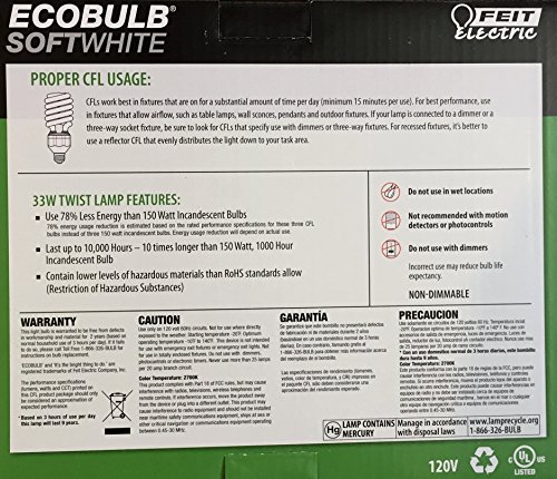 Product DescriptionFeit Electric EcoBulb Soft White 33W Extra Bright 150W Equivalent Compact Fluorescent Light Bulb CFL 3 Pack0