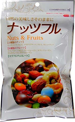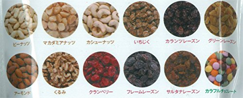 原材料:落花生、フレームレーズン、サルタナレーズン、砂糖、いちじく、カランツレーズン、クランベリー、アーモンド、くるみ、グリーンレーズン、カシューナッツ、植物油、マカダミアナッツ、ココアパウダー、脱脂粉乳、米粉、ホエイパウダー(乳製品)、全脂粉乳、食塩、澱粉、コーンシロップ、ゼラチン、乳化剤、安定剤(アラビアガム)、着色料(ベニコウジ、フラボノイド、クチナシ、パプリカ色素、アントシアニン、スピルリナ青)、香料、調味料(アミノ酸)、光沢剤、(原材料の一部に大豆を含む)