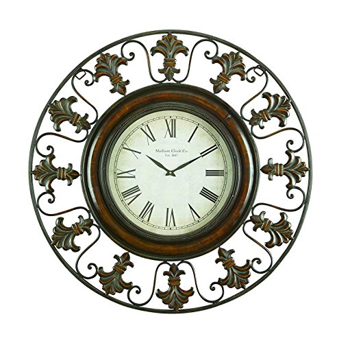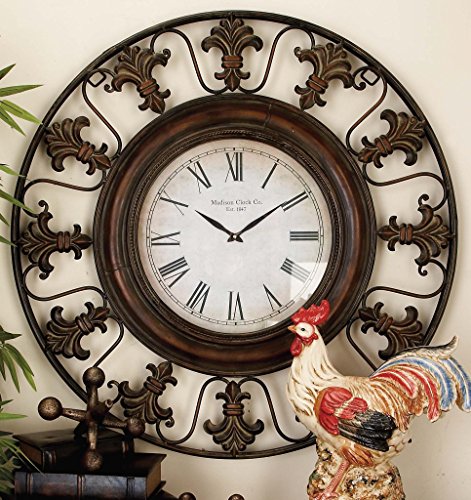 -. Feature : Dimensions: 38 diam. x 5D in. / Wrought iron frame / Distressed finish / Rustic round analog wall clock / Black roman numerals