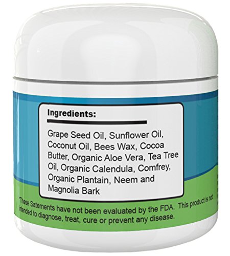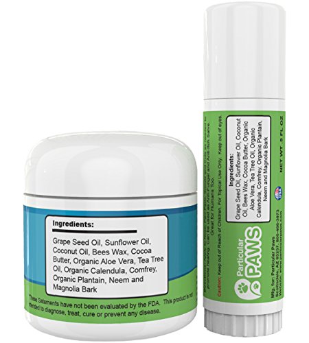 100% ALL NATURAL: Contains grape seed oil, sunflower oil, coconut oil, bees wax, cocoa butter, organic Aloe Vera, tea tree oil, organic calendula, comfrey, organic platinum, neem and magnolia bark. All ingredients are safe for both dogs and people. There are no toxins, preservatives or other chemical additives. Formula is non-greasy. Even if your dog licks the formula after application, he or she will be perfectly safe.