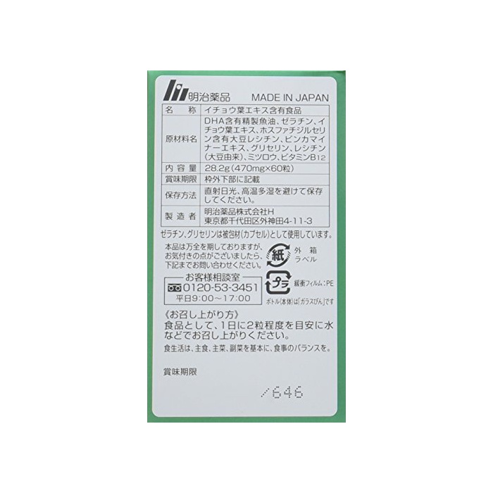 원재료:DHA함유 정제어유,젤라틴,은행나무잎 엑기스말,vinca 마이너 엑기스말,《호스후치지루세린》함유 (phospholipid)인지질,감자 전분,《세린》,글리세린,레시틴,《미츠로우》,비타민B12,(원료의 일부에 대두를 포함한다