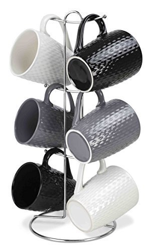 Enjoy a delicious cup of coffee or Tea with this beautiful Home Basics 6 cup mug set. The 11-Ounce 6 Cup Mug Set with Rack is a beautiful set that includes two mugs in each of the following colors: Black, Gray and White. This Home Basics 6 Cup Mug Tree comes is made from high quality ceramic material and has a textured finish for unique and cool design. On busy mornings, never worry about not having enough mugs for everyone's cup of morning coffee. Mugs are microwave and dishwasher safe. Mug tree is made out of heavy duty chrome stand. This Home Basics Mug Set is a fun and practical way to organize and display your mugs. Perfect for everyday use, it can be used for coffee, tea, hot chocolate, soup and more. What's included in the box: - Chrome finish mug tree