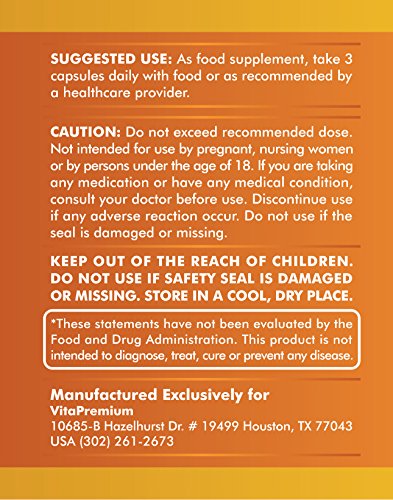 -. Feature : ✔ Say NO to PAIN & INFLAMMATION - Customers say that Vita Premium Turmeric can help with Joint and Muscle Pain, Anti-Inflammatory, Depression, Anti-aging and Cell health. Many people call Turmeric - "The Wonder Spice" due to the amazing health benefits it can provide. / ✔ ORGANIC INGREDIENT - Don't settle for non-organic Turmeric. Vita Premium offers ORGANIC TURMERIC powder to help protect you from toxins, pesticides and heavy metals! / ✔ MAXIMUM ABSORPTION - Our Turmeric Curcumin Capsules contain BLACK PEPPER EXTRACT (Piperine), which significantly increases supplement absorption in the body. Studies show mixing Piperine with Turmeric enhances the amount of turmeric absorbed by the body by up to 20 times compared to regular turmeric. / ✔ THE RIGHT TURMERIC - Vita Premium Turmeric Curcumin is also VEG FRIENDLY, NON GMO, GLUTEN FREE, SOY FREE and DIARY FREE. / ✔ YOU WILL LOVE IT! Our 100% MONEY-BACK GUARANTEE offers a peace of mind for all our customers - Feel Better or Your Money Back! No questions asked.