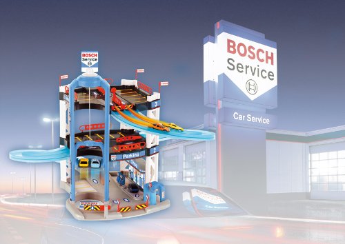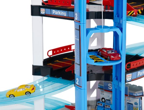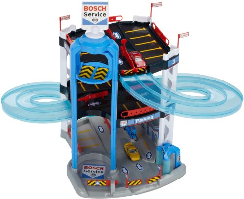 Theo Klein Bosch Car Service ParkhausDas Bosch Parkhaus ist auf 3 Ebenen mit zweispurigen Abfahrrampen verbunden. Das Parkhaus besitzt einen Aufzug, mit dem die beiden mitgelieferten Autos schnell in die oberen Etagen befördert werden können. Außerdem gibt es eine Tanksäule sowie eine Waschstraße.