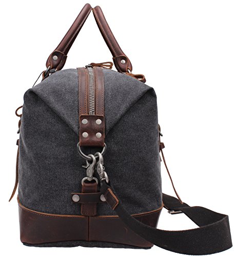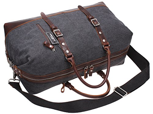 - Feature : LARGE THICK CANVAS LEATHER DUFFLE BAGS- The body of this bag is made with high density canvas and has a top quality crazy horse leather trim. Both of these materials together create a modern yet classic look and feel. / THE TRAVEL LUGGAGE TOTE HANDBAG HAS STRONG AND STURDY HARDWARE- the buckles, rivets, clips and round rings are all of good quality. / THIS CARRY ON GARMENT BAG GENERAL USE FOR MENS AND WOMENS- It also can be as a business travel bag,large tote handbag,overnight duffle bag.It's very spacious and can hold at least 2 - 3 days worth of clothes if necessary. / THE WEEKEND OR SPORTS GYM BAG HAS MANY POCKETS- Outside : one front pocket ,one back pocket. Inside :one zipper pocket , one zipper pocket,two side pouch and two holders for pens . / Note : Maybe there are a few scratch on the leather,that's normal.If you have OCD about things staying "perfect looking" this bag is not for you.A wonderful and practical gift or present for Valentine's Day,Father's Day,Teachers' Day,Thanksgiving, Christmas, Birthday or almost any other occasion.