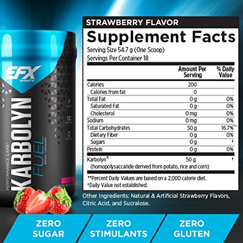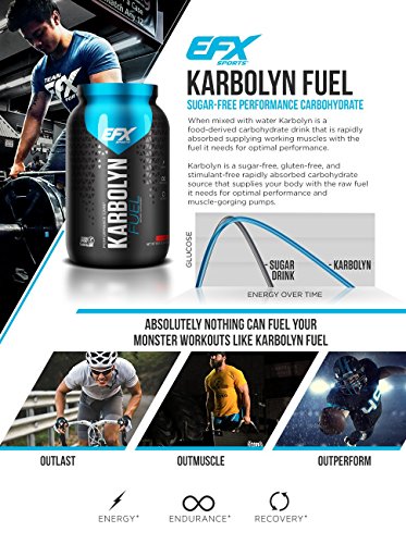 -. Feature : CARB LOAD, THE BETTER WAY - You want to have the energy to push yourself harder and build some sizeable gains. Karbolyn is derived from real starchy carbs - potato, rice, and corn, not sugars so it is easy to digest. The secret lies in its molecular structure allowing for fast digestion and sustained energy. Karbolyn uses a proP.R.Ietary multi-stage Enzymatic Milling Process to reach optimal molecular size. This yields a superior carbohydrate for rapid absorption into the bloodstream. / TESTED AND TRUSTED - No one tests like EFX Sports. When you invest in EFX Sports products, you are putting your faith in the efficacy and purity of our ingredients, and the integrity of our brand. That's why we never take that trust for granted. From dock-to-dock, we own every phase and process to ensure that what's on the label is what's in the bottle... without question. Karbolyn contains no banned substances and can be used for workouts, bodybuilding, or any athletic event. / A COMMITMENT TO YOU - THE EFX WAY - The EFX Sports mission is to provide you with tools so you can see your dreams become a reality in competition, on the field, in the gym, or on stage. We always have been, and will always be, committed to doing whatever benefits our customers the most. We lead the Sports Nutrition Industry into a of innovation, information and integrity, our Mission, combined with the needs of our customers, will determine our path. Our values will be our guide. / KARBOLYN FUEL - If you are a professional athlete you know the critical, game-changing importance of eating enough carbs. But, all carbs aren't create equal. Simple carbohydrates have the ability to enter the bloodstream quickly. However, they can also stimulate a strong "spike" and subsequent "crash" due to a rapid rise and fall of insulin levels. Complex carbohydrates do provide sustained endurance. But, they are slow to digest. That's why athletes have been searching for the perfect "fuel" to / CLINICALLY PROVEN - SUSTAINED ENERGY OR YOUR MONEY BACK - Don't take our word for it... What does the study say? The clinical study sought to document whether or not Karbolyn has a positive and sustainable impact on blood sugar levels in normal adults during aerobic activity. Data obtained from participants indicated that Karbolyn is absorbed 18.2% faster than Dextrose and still provides sustained energy without 'crashing'. Men and women looking for a non-habit-forming product that produces result