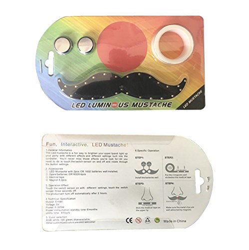 [PACKAGE INCLUDED] 1 * LED Luminous Mustache, 4 * CR1632 Button Cells(2pcs installed, 2pcs for spared), 1 * Medical Gummed Paper,2* Magnet