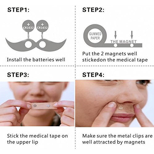 [ EASY TO WEAR] Long press the sensor button on the middle of the mustache for about 3 seconds to turn on and off. Put the magnets well on the adhesive tape then stick the tape on your upper lip and attach the mustache well.