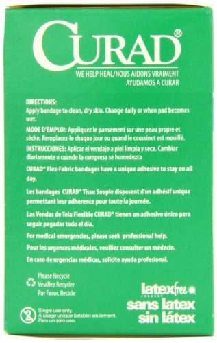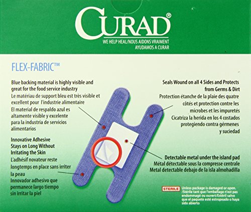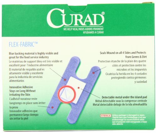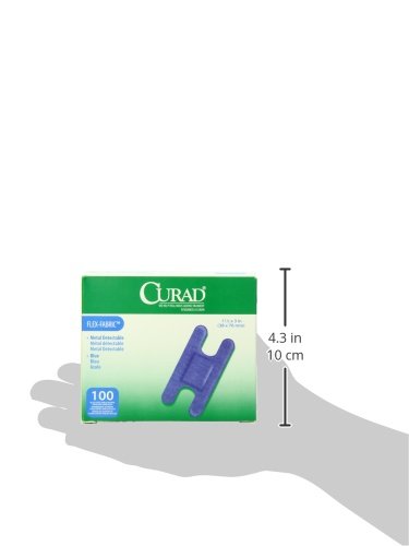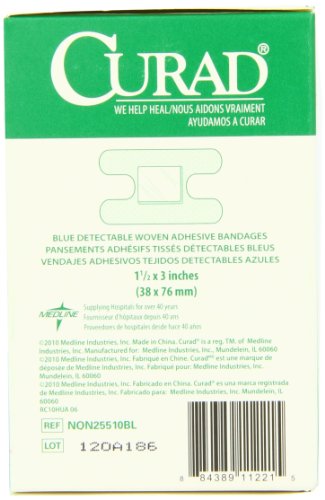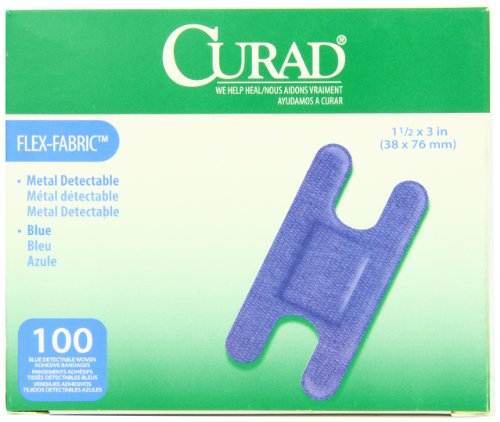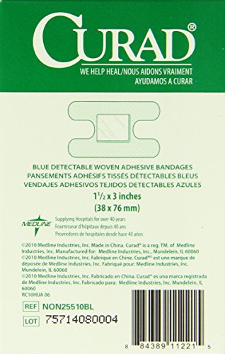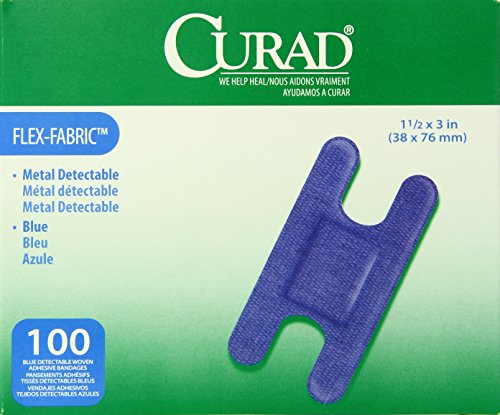 -. Binding : Health and Beauty -. Brand : Curad -. EAN : 0033586843051 -. Feature : CURAD® blue bandages meet the needs of the food service industry with their high visibility and innovative, long-lasting adhesive that's gentle on the skin / Detectable metal hidden behind the non-adherent wound pad easily triggers metal detectors used by food packagers / This routine process scans for dangerous metal debris such as screws or knife tips that can accidentally fall into food during processing / In addition, the highly identifiable blue color stands out in all different foods / All of our bandages seal around all 4 sides to protect from dirt and germs -. IsAdultProduct : 0 -. Label : Curad -. Manufacturer : Curad -. Model : NON25510BL -. MPN : LYSB004Z6MQI4-SPRTSEQIP -. NumberOfItems : 1 -. PackageQuantity : 1 -. PartNumber : LYSB004Z6MQI4-SPRTSEQIP -. ProductGroup : Health and Beauty -. ProductTypeName : HEALTH_PERSONAL_CARE -. PublicationDate : 2011-05-02 -. Publisher : Curad -. ReleaseDate : 2011-04-26 -. Studio : Curad -. Title : Curad Knuckle, Woven Blue Detectable Bandage, 100-Count -. UPC : 884389112215