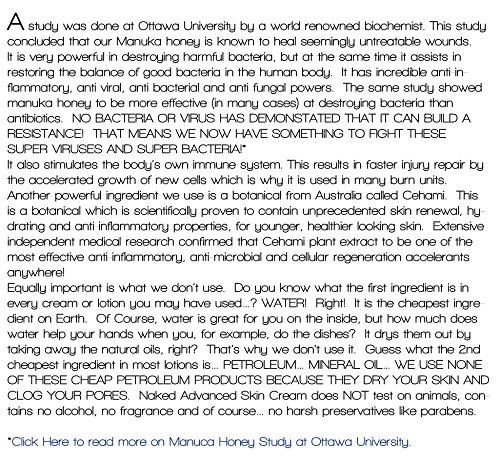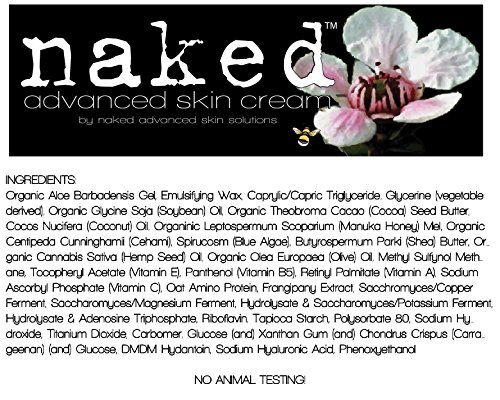 -. Feature : Come in a Large 9 oz Jar. (266 ml) / Naked Advanced Skin Cream Contains Active Organic Manuka Honey from New Zealand. / NO ANIMAL TESTING. NO Added Fragrance. / Proudly Made in the USA! / What is Naked Advanced Skin Cream? A result of extensive research into the very most effective ingredients in skin care, including several newly discovered. Designed for both face & body this is a complete solution in skin care and cellular regeneration. This formula is highly organic, and contains Aloe Vera, Amino Acids, Vitamins and minerals, Shea Butter and some incredible natural oils the skin needs. We also use a special grade of Algae which contains almost every organic mineral in trace amounts, which is what the skin needs to heal.