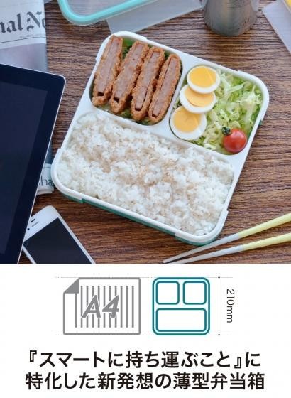 A4サイズ幅で厚さ35mmの薄型弁当箱。通勤通学時の持ち運びがスマートに!!しっかり固定の4点ロックで汁漏れの心配もありません。ランチプレートの雰囲気で食べられて、容量も800mlとたっぷり入ります!! |