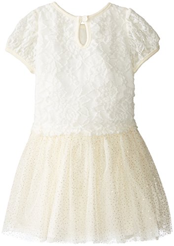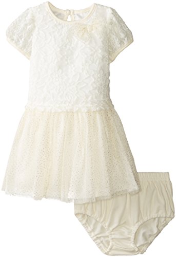 Dress with floral printed bodice tacked on flower and printed mesh glitter attached skirt with ruffles and panty