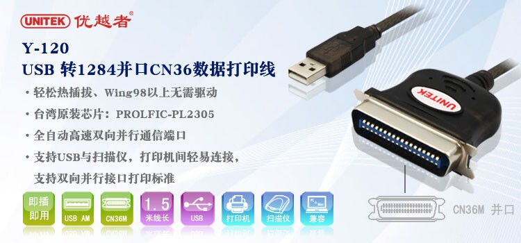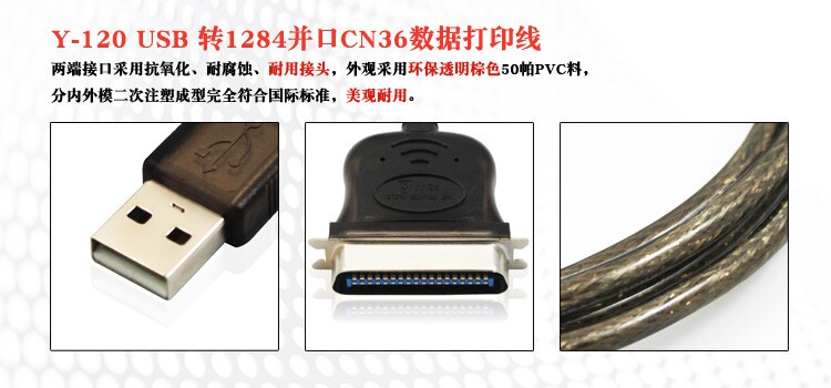 优越者 Y-120 产品是USB 转并行端口(CN36)数据打印线,是针对并口打印机而设计的高速转换连接线,通过转换线现实并口打印机直接与电脑的USB接口通信。
