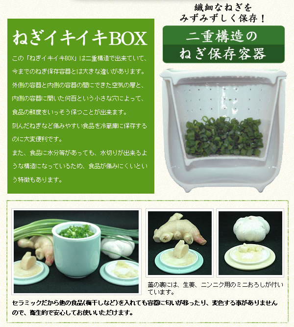 料理の味を引き立て、彩りを添える名脇役、ねぎ。刻んで保管するときに便利なセラミック製二重構造の保存容器です。匂い移りしないので他の食品を入れてもOK!