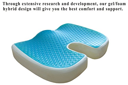 - Feature : Gel/Foam hybrid design: it is made of a specifically engineered gel layer molded on top of our highest quality foam, adding superior comfort to your chair. You get a high-end product at a fraction of the cost of what you need to pay at upscale specialty stores. / Helps to reduce pressure on the coccyx and hip bones while sitting on chairs, car seats, planes and wheelchairs / Promotes healthy posture and spine alignment / Helps with treatment of sciatica, pressure ulcers, injured tailbone, and more / Zippered, machine-washable velour cover for easy cleaning. Built-in handle for easy transport
